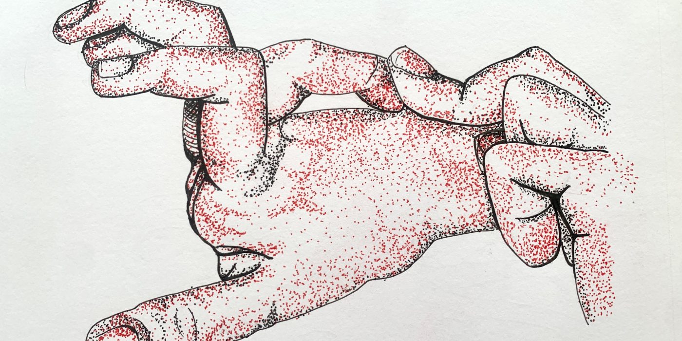 Black and red pen on paper. This illustration was inspired by Figure 1 in the review article, Bönnemann, C. The collagen VI-related myopathies: muscle meets its matrix. Nat Rev Neurol 7, 379–390 (2011). https://doi.org/10.1038/nrneurol.2011.81