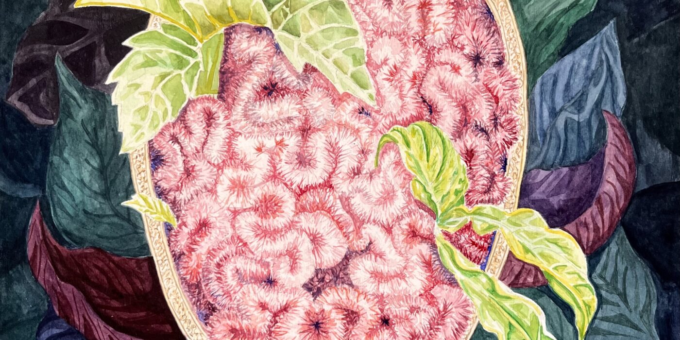 The crested celosia flower and its colorful folds resemble the gyri and sulci of the brain. Looking at this flower made me wonder how our brains process color and texture. Additionally, how do these stimuli bring us pleasure and joy? Could walking through a garden full of color, texture, and smells restore information processing pathways in the brain after a traumatic brain injury?