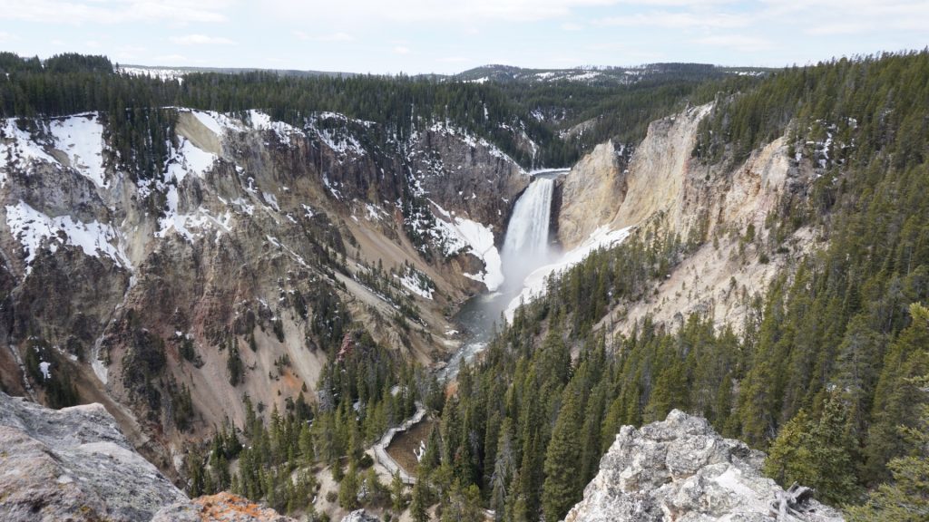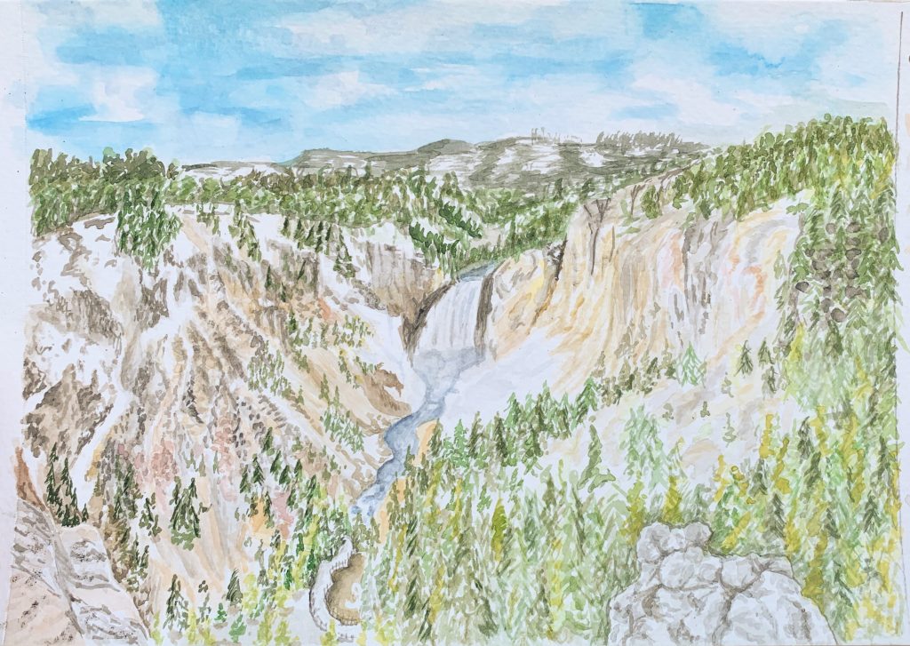 This painting was created using watercolors and is approximately 5″x7″. While searching for the perfect spot to pull over and eat lunch, my partner and I came across this amazing view of Lower Falls. Along the left ridge you can still see snow, which covered higher points of the park. In May, the lush green foliage is beginning to emerge among the evergreen tress. Along with herds of bison we saw newborn bears and elk. It was stunning to see life in so many different forms and colors.